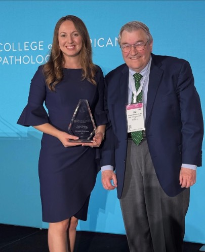 Receiving the CAP Resident of the Year award is, as she describes it, “a lifetime meritorious achievement.” The award, selected by the CAP House of Delegates, recognizes leadership, advocacy, education and innovation in pathology. She was nominated by mentors, colleagues, and students she has mentored—many of whom have seen her passion for pathology firsthand.
